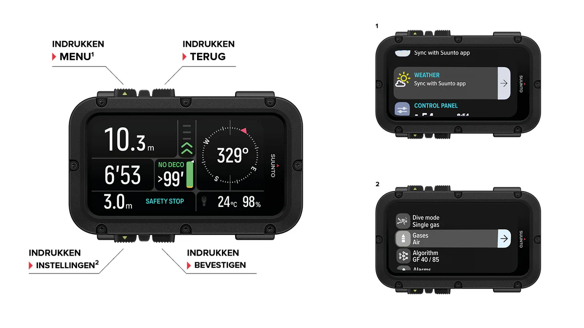 Geavanceerde duikfuncties (o.a. single- & multi-gas, sidemount, planner, kompas, alarmen, aanpasbare weergaven)